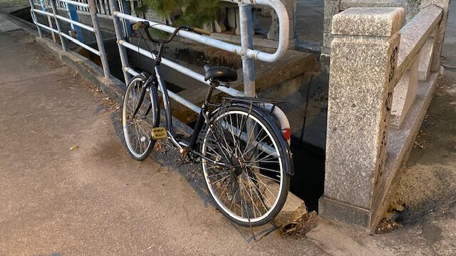自転車が神社正面付近の道路に止めてあったので、自治会を通じて交番に連絡したところ・・自転車に張り紙...