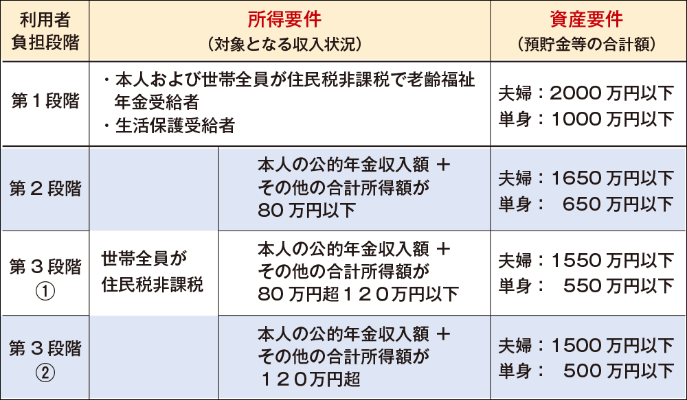 介護保険施設(介護老人福祉施設・介護老人保健施設・介護療養型医療施設・介護医療院)や短期入所(ショートステイ)の利用でかかる食費・居住費の負担を軽減することができる「特定入所者介護サービス費(補足給付)」という制度があります。この制度を利用するためには、「介護保険負担限度額認定」を受ける必要があります。「介護保険負担限度額認定」を受けるには、所得要件と資産要件がありますが、要件に該当しない方は、対象外となります。