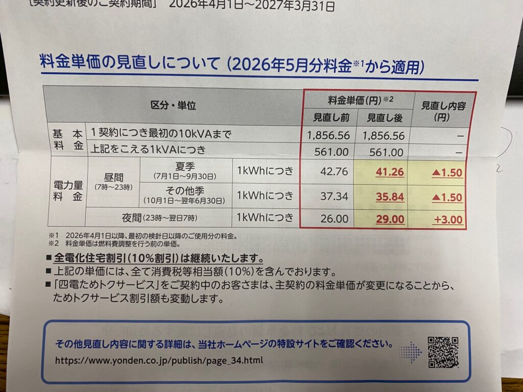 おじさん家(ち)は電化住宅なので10%の割引があるのだが、値上げの春の訪れとともに「ご契約の更新について」とタイトルした封書が四国電力から送られて来た。期間は2026年4月1日から2027年3月31日までとある。おまけに 出して来た単価(1Kwh)は燃料費調整を行う前の価格とまで 念入りに書いている。1年しかない短い契約期間で・・燃料費調整がいるのか?と思ってしまう。これにて5月からの電気代は上がるとのことは決定である。これからも こまめの照明スイッチなどの入切と冷暖房温度の節約管理が求められる。